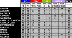 El PP mantiene su dominio en las comunidades de Madrid, Valencia, Castilla-León, La Rioja, Murcia, Aragón, Baleares, Navarra y Cantabria. Las cinco primeras con mayoría absoluta. El PSOE hace lo propio en Castilla La Mancha -donde Bono logra su tercera mayoría absoluta-, Extremadura -con Ibarra perdiendo fuerza-, y en Asturias. En la capital Alberto Ruiz Gallardón ha mejorado con un escaño más sus resultados de 1995 y podría haber anunciado a sus colaboradores sus deseos de intentar el salto a La Moncloa. Sin embargo, no ha sido fácil, pues durante gran parte del recuento perdía su mayoría absoluta y asistía al asombrante ascenso del PSOE-progresistas de la mano de Cristina Almeida, quien ha mejorado en cuatro escaños los resultados de 1995.