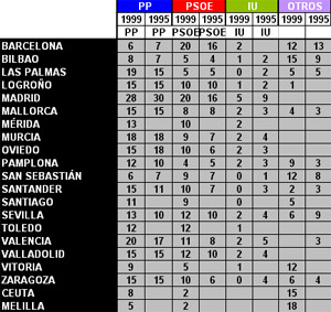 Otro de los fallos del PP ha tenido su repercusión en la capital asturiana, Oviedo. Los populares mantienen la alcaldía pero pierden tres concejales por la pérdida de credibilidad del partido tras el `caso Marqués´, concejales que pasan al PSOE. El caso contrario a Oviedo se produce en Valencia donde el PP aumenta en tres el número de concejales, aprovechándose del descenso de IU y de Unión Valenciana. Con relación a los descensos de IU es paradigmático el caso de Zaragoza, donde la coalición que dirige Julio Anguita desaparece del Ayuntamiento y sus votos los recoge el PSOE.